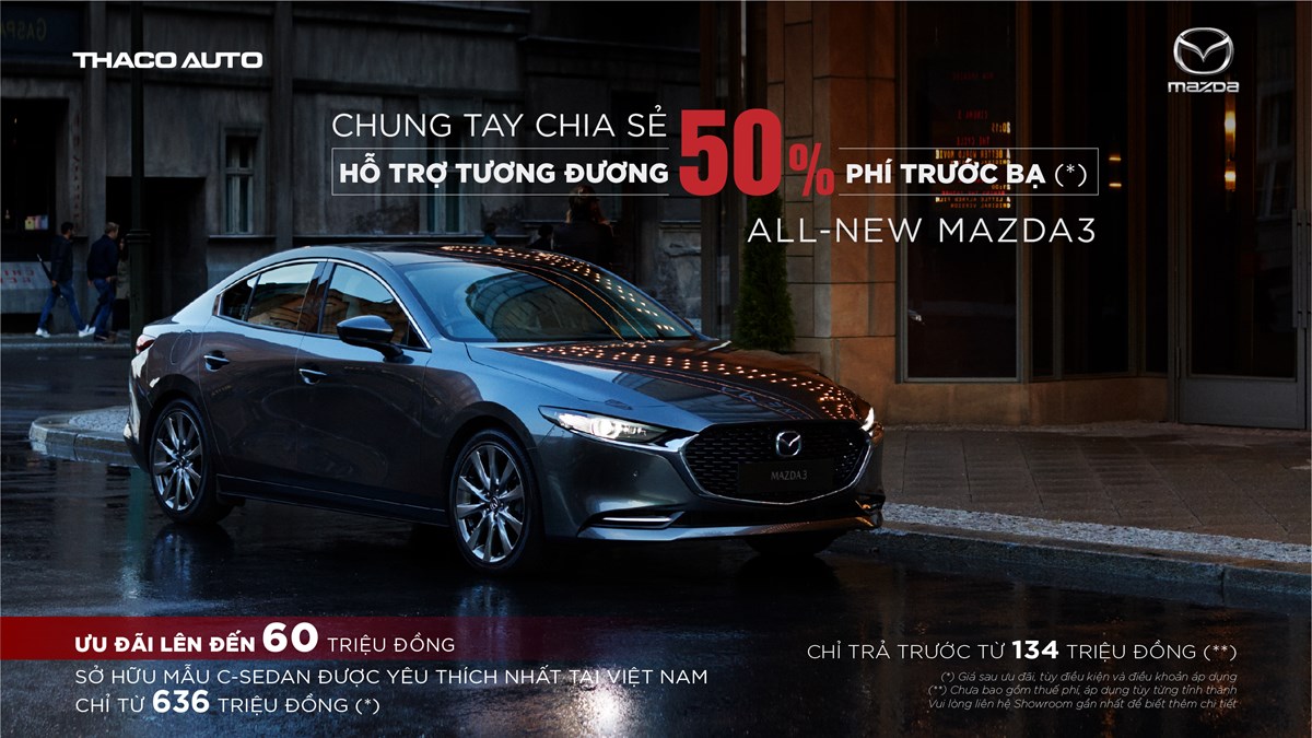All-New Mazda3, mẫu xe đạt giải thưởng “Thiết kế đẹp nhất năm 2020” do hội đồng Giải thưởng ô tô thế giới (WCA) công bố cũng được Mazda Việt Nam hỗ trợ lên đến 60 triệu đồng, tạo điều kiện tốt cho khách hàng mong muốn sở hữu mẫu xe thế hệ thứ 7 đầu tiên tại Việt Nam với giá sau ưu đãi từ 636 triệu đồng. Ngoài ra, với ưu đãi vay mua xe đang được áp dụng, khách hàng chỉ cần trả trước từ 134 triệu đồng, có thể sở hữu ngay chiếc xe yêu thích.