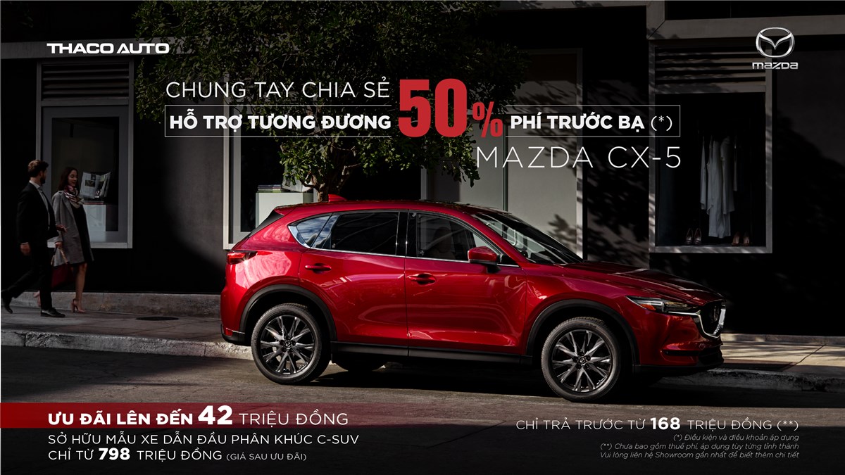 New Mazda CX-5, mẫu xe dẫn đầu phân khúc SUV tầm trung về doanh số đầu năm 2021 cũng đang được hỗ trợ tương đương 50% lệ phí trước bạ đối với phiên bản động cơ 2.0L, giá bán sau ưu đãi chỉ từ 798 triệu đồng. Đồng thời, với ưu đãi vay mua xe đang được áp dụng, khách hàng chỉ cần trả trước từ 168 triệu đồng.