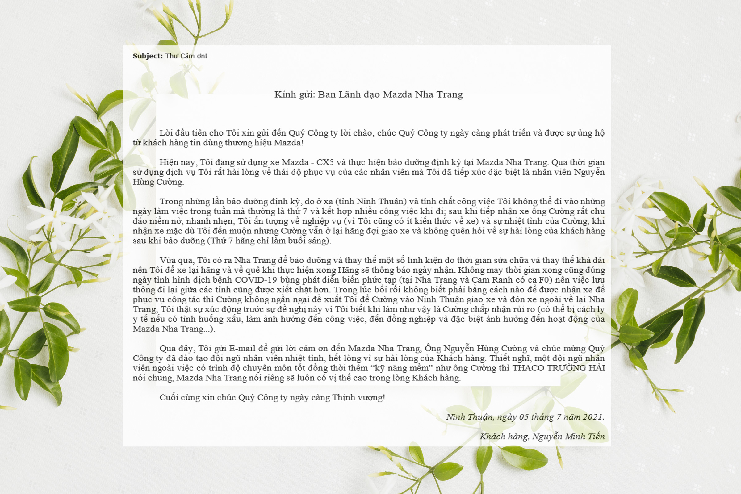 Anh Nguyễn Hùng Cường – TVDV Mazda Nha Trang được khách hàng viết email khen ngợi vì sự tận tâm, chu đáo và chuyên nghiệp của mình.